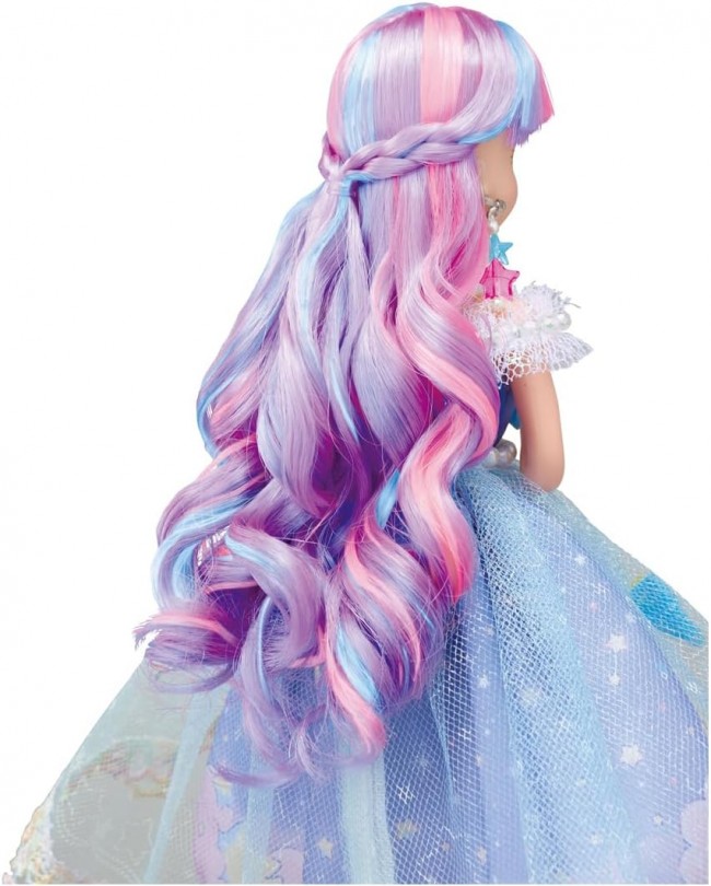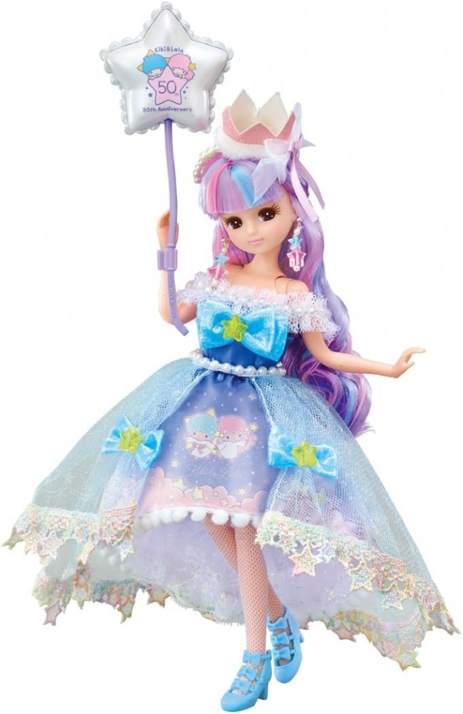 A special edition doll from the Photogenic Licca series celebrates the 50th anniversary of Little Twin Stars with a collaboration. It features the Neo Licca body with movable joints, popular among adult Licca fans. The special outfit includes a one-piece dress with an overskirt featuring a Kiki & Lala print full of star motifs. Includes a special hairstyle with three-color braids and curls, a headband, star-shaped earrings, a star-shaped balloon printed with the 50th anniversary Kiki & Lala design, plus a cape, tights, gloves, and shoes. The Neo-Rika body allows movement at the shoulders, hips, knees, wrists, and ankles. Enables various poses like shrugging shoulders, turning legs inward, or bending knees to sit. 【Set Contents】Doll*Neo-Rika Body (wearing dress, earrings, tights, shorts) (1), Cape (1), Gloves (1), Headband (1), Shoes (1), Balloon (1), Stand (1), Stand Base (2) (C) TOMY (C) 2025 SANRIO CO., LTD. TOKYO, JAPAN (L)