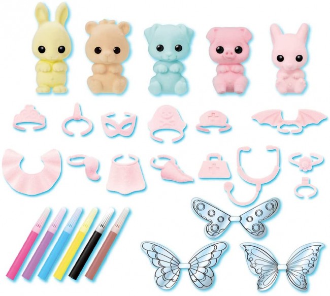 [Set contents] Rabbit (small size) (1), bear (1), inu (small size) (1), mouse (1), lid (1), accessory (14), butterfly splash (3), Pink (thin pen) (1), purple (thin pen) (1), blue (thin pen) (1), brown (thin pen) (1), black (thin pen) (1), yellow (thin pen) (1)