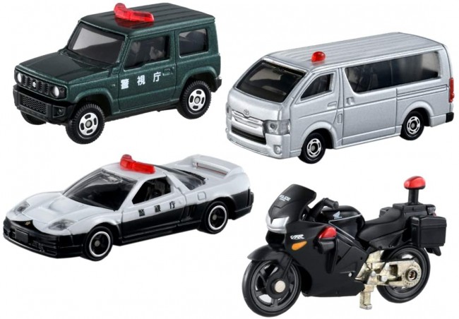 Honda NSX-R (patrol car) (1), Suzuki Jimny (patrol car) (1), Toyota Hiace (masked patrol car) (1), Honda VFR (black bye) (1)