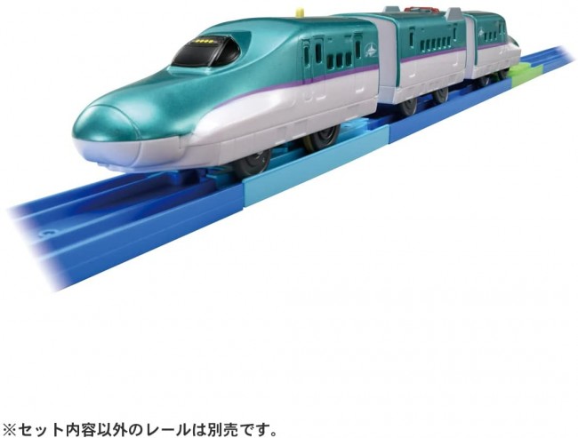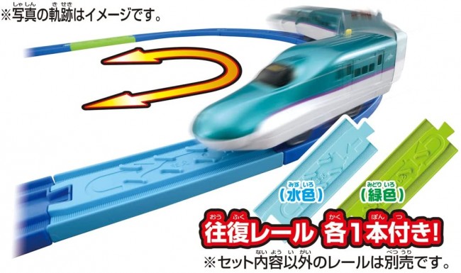 JR Hokkaido "H5 Series Shinkansen" is now available with a reciprocating chassis that allows you to go back and forth wherever you like. ■ JR Hokkaido "H5 Series Shinkansen Hayabusa" is a model ■ Equipped with reciprocating chassis ■ Round-trip rail (light blue / green) 1 each ■ It is possible to play with some bodies on the reciprocating chassis (details will be announced on the homepage) ■ Three-car train can be connected and disconnected respectively ■ Hand-rolling play is possible with 1-speed switch OFF ■ With plastic train card * Rails other than the set contents are sold separately. [Set contents] Vehicle body (1), reciprocating rail (light blue) (1), reciprocating rail (green) (1), plastic train card (1), parts order form (1) (c) TOMY JR Hokkaido commercialization licensed Uses one AA battery (batteries are sold separately.) * To prevent accidental ingestion, a "screw-fastened" battery case is used.
