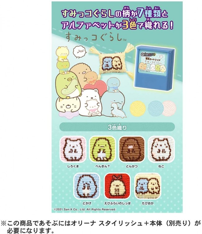 You can weave cute Sumiko characters! You can also weave the tails of popular lizards and fried shrimp! Cartridge for exclusive use of "Orina Stylish +". You can weave 7 "Sumikko Gurashi" patterns and 3 colors of the alphabet! [Set contents] Cartridge body (1), instruction manual (1) (c) TOMY (c) 2021 San-X Co., Ltd. All Rights Reserved.