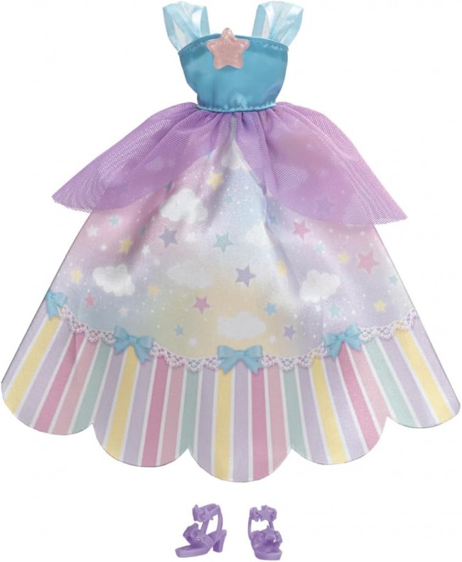Rika-chan's long dress features a rainbow skirt studded with stars. This adorable long dress showcases a rainbow sky design with a star accent on the chest. Includes purple star sandals. 【Set Contents】Dress (1), Sandals (1) (C) TOMY