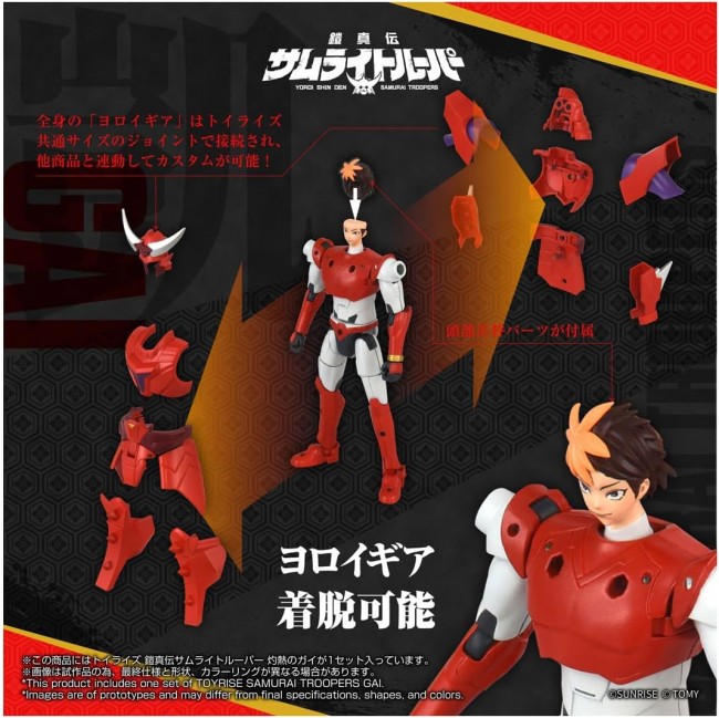 Action Figure (Anime/Sci-Fi Character) Reborn! The Samurai Who Transcends Time, Now Appears! When the seal on the demon realm that once terrorized the human world was broken, countless demon soldiers began their invasion. Rushing to humanity's aid were five young samurai. Their name: Samurai Troopers!! Their days of battle now begin anew! ・Toyrise presents “Samurai Troopers: Yoroi Gear - Scorching Guy” as a 15cm tall action figure! ・Faithfully recreates the style seen in the anime when wearing the “Yoroi Gear”! ・Features robust articulation throughout the body for dynamic posing! ・Includes the two signature Blazing Swords of Blazing Guy. They can be sheathed and mounted on his back! ・The chest features a shoulder pull-out mechanism, enabling various sword-wielding poses! ・The entire “Yoroi Gear” is connected via Toyrise standard-sized joints, allowing customization and compatibility with other products! ・Includes interchangeable head parts, allowing recreation of the “Under Gear” state with “Yoroi Gear” removed! Contents Main Body (1), Sword Part A (1), Sword Part B (1), Sheath Part (1), Full Set of Hair Parts (1), Instruction Manual (1) (C) TOMY (C)SUNRISE