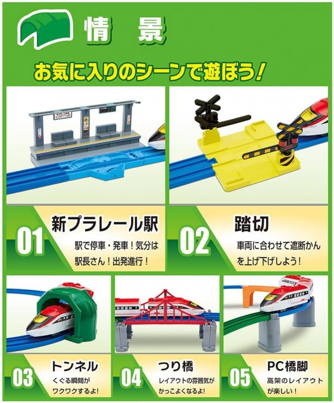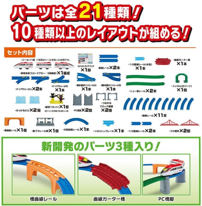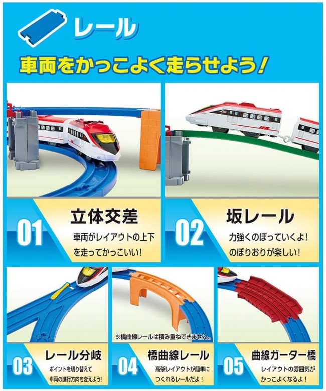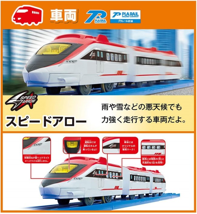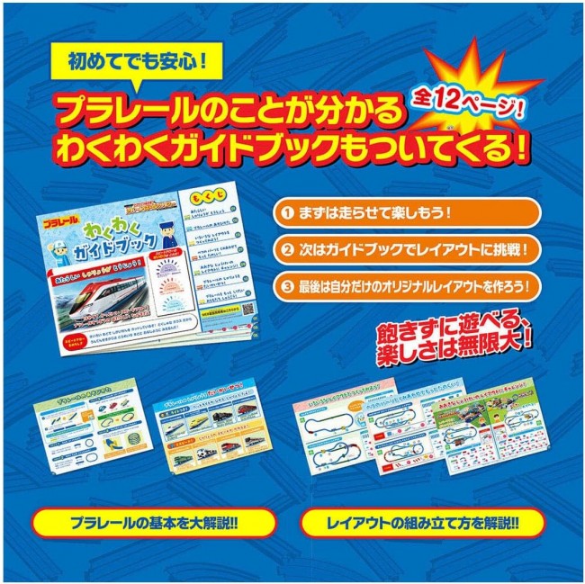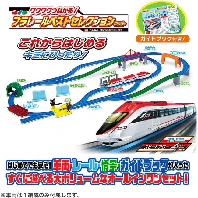 Perfect for beginners! This all-in-one set includes everything you need to start playing right away: “trains,” “tracks,” “landscapes,” and a “guidebook”! Featuring original new trains and parts, this large-volume set lets you create over 10 different layouts. This all-in-one set includes the original new “Speed Arrow” vehicle, plus easy-to-build elevated sections with “Curved Bridge Rails” and “PC Bridge Piers,” along with a “Station,” “Crossing,” “Suspension Bridge,” “Curved Girders Bridge,” and ‘Tunnel’?everything you need to start playing right away! Plus! It comes with an “Exciting Guidebook,” so even kids new to Plarail can play with confidence! It's not just about building layouts?it covers everything from how to play with Plarail to a popular vehicle guidebook, giving you the complete Plarail experience! With 21 different parts total! This set alone lets you build over 10 different layouts, making it a truly substantial product. ■ The vehicle is the original high-speed “Speed Arrow.” ■ “Curved Bridge Rails” combine straight rails and block piers into one piece, making it easy to build elevated tracks. ■“PC Bridge Piers” feature claws that securely support the rails. You can also stack PC Bridge Piers. ■“Curved Gutter Bridges” can be placed directly on the floor or installed atop bridge piers. ■“Stackable Buildings” can be used as building scenery or have rails placed on them to function as bridge piers. ■“Connectable Block Bridge Piers” can be split into two parts, each usable as a single bridge pier. 【Set Contents】 Vehicle Body (Speed Arrow/3-Car Set) (1), Straight Rail (2), 1/2 Straight Rail (2), 1/2 Straight Rail (Light Blue) (1), Curved Rail (11), Double Curved Rail (1), Single/Double Track Point Rail (A) (1), Single/Double Track Point Rail (B) (1), Turnout Rail (L) (2), Turnout Rail (R) (1), Half Stop Rail (1), New Slope Rail (2), Bridge Curve Rail (1), Curved Gutter Bridge (1), Level Crossing (1 set) (1), Tunnel (2 parts)(1), Building (2), PC Bridge Piers (2), Connectable Block Bridge Piers (2), Suspension Bridge Frame (2), New Plarail Station (1), Sticker (1), Exciting Guidebook (1), Parts Order Form (1) (C) TOMY Requires one AA battery (battery sold separately). *To prevent accidental ingestion, the battery case lid uses a “screw-on” design.
