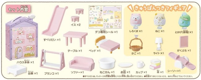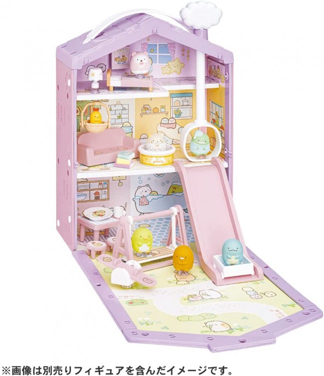 Stick together! A house where you can play with Sumikko figures with suction cups is now available with a cute purple roof ♪ Stick together! A house where you can play with Sumikko figures with suction cups ♪ Since it has a suction cup, you can play with various scenes of Sumikko Gurashi. Lots of furniture such as tables, beds and sofas! Small items that have been played can be stored in the house and carried as a bag. The cute figures, whether you play or decorate them, come with three figures: a polar bear in pajamas, a cat, and a lizard (genuine). [Set contents] House body (1), swing (1), cat (1), lizard (genuine) (1), basket (with suction cup) (1), seesaw (with suction cup) (1), book (1) , Cup (1), Gakubuchi (with suction cup) (1), Lamp (with suction cup) (1), Sofa (1), Sliding chair (1), Cart (1), Nekokan (1), Swing (1), Bed (1), table (1), chair (2), plate (1), deco sticker (1) (c) TOMY / OLM / Girls x Heroine 2021 Project / TV TOKYO