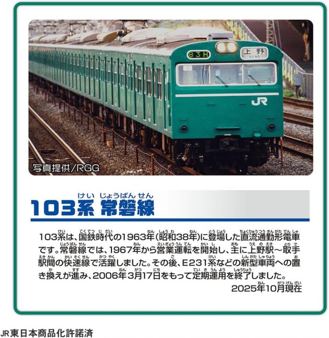 The 103 Series is a DC commuter train introduced in 1963 (Showa 38) during the Japanese National Railways era. It began revenue service on the Joban Line in 1967, primarily operating on the rapid line between Ueno Station and Toride Station. Subsequently, replacement by newer rolling stock such as the E231 Series progressed, and it ended regular service on March 17, 2006. ■Based on the “103 Series on the Joban Line” ■3-car formation with coupling/uncoupling capability ■Electric running at 1 speed; switch OFF for manual pushing play ■Includes plastic train card ※Tracks not included. 【Set Contents】Vehicle body (1), Plastic train card (1), Parts order form (1) (C) TOMY JR East Japan Licensed Product Requires 1 AA battery (battery sold separately).