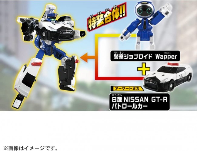 Police Braver NISSAN GT-R Patrol Car" from "Tomica Heroes Jobber Special Combination Robot", a new hero born from Tomica! Armor Tomica "NISSAN NISSAN GT-R Patrol Car" combines with a police jobber to become a police robot "Police Braver NISSAN NISSAN GT-R Patrol Car"! Protect the city with the Jobber and other Jobber robots (sold separately)! The Police Jobroid can also be combined with the armor micas included with other products in the Jobber series. Weapon parts are included. Armor Tomica (NISSAN NISSAN GT-R Patrol Car) upper body parts (1), Armor Tomica (NISSAN NISSAN GT-R Patrol Car) lower body parts (right) (1), Armor Tomica (NISSAN NISSAN GT-R Patrol Car)Lower body parts (left)(1),Police jobroid(1),Weapon(1),Label(1),Instruction manual(1) (c) TOMY