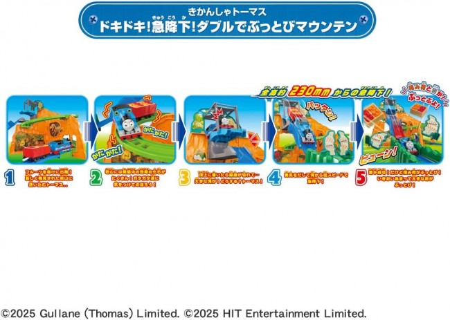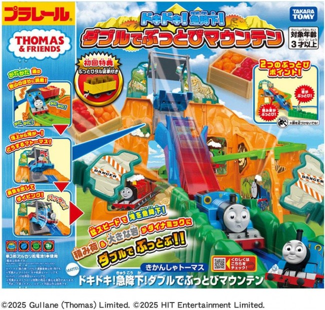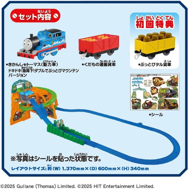 Thomas the Tank Engine hurtles down the waterfall at breakneck speed! The momentum of the steep descent sends both the cargo and a huge boulder flying in a dynamic double blast! Thrill-packed!! Thomas the Tank Engine zooms down from a mountain peak about 230mm tall like a roller coaster!! The cargo flies off due to the momentum! Plus, the big rock blocking the way also gets blown away! 1. Departing to deliver the cargo (fruit)! Thomas gets lost in the rocky mountain... 2. Climbing bumpily around the rocky mountain! 3. Oh no! The tracks end abruptly! 4. Summoning courage, he plunges down the waterfall at breakneck speed! 5. Splashdown success! Amazing, Thomas! 6. But the cargo flies off! 7. The momentum even sends a huge rock flying! All-in-one set containing Thomas train, Mountain Panel, and Rails Run it together with other Plarail Thomas Series trains sold separately! *First edition includes a Flying Barrel Wagon. 【Set Contents】Mountain Panels (1-4) (4), Slope Rails (A-F) (6), Slope Rails (Top/Bottom) (2), Brake Rail (1), Bridge Rail (1), Bridge Gate (1), Bridge Rods (2), Summit Panel (1), Straight Rails (2), 1/2 Straight Rail (1), Curved Rails (6), Stop Rail (1), Thomas the Tank Engine (Motorized) (1), Sticker (1), Parts Order Form (1), Rock Parts (Right) (Left) (2), Freight Cars (2), Fruit (2), Barrels (2) (C) TOMY (C)2025 Gullane (Thomas) Limited. (C)2025 HIT Entertainment Limited. Requires one AA alkaline battery (battery not included).