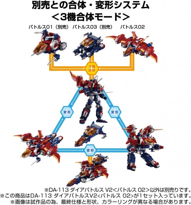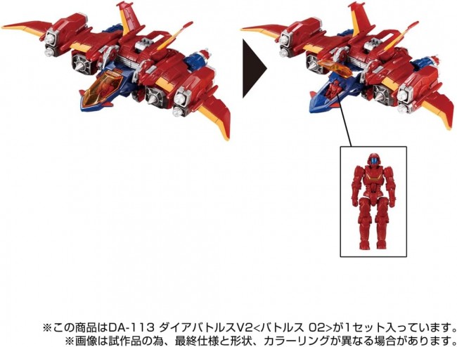 Action Figures (Animation/Science Fiction Characters) Diabattles V2 is launched! Diabattles is a high-speed flying combat machine with excellent maneuverability. It consists of arm arm armament units + aerial maneuvering boosters and a single-seat bollet module machine that controls the arm arm armament units. The armament units have a number of function-specific options, which can be selected or converted according to the nature of the mission. Differences from DIABATORS V2 (1) The red molded parts are the same color as those of the DA-109 DIABATORS X-1! (2) Fist parts have been changed from PVC to ABS, and the fingers can be opened and closed! Contents Battles 02 (wing parts) (1), arm parts (2), Battles 02 cockpit (1), sword (2), joint parts for sword (2), Diaclone Crew Ver.2.0 (1), instruction manual (1), brochure (1) (C)TOMY