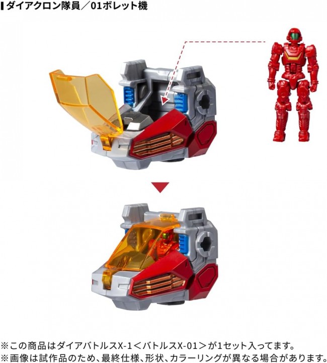 Action Figure (Anime/SF Character) DA-117 Dia Battles X-1 The Dia Battles X-1, the Diaclone team's versatile main combat machine boasting a three-machine combination system and excellent aerial maneuverability, has been upgraded and is now available! The versatile combat machine , capable of operating in any environment, is now equipped with new weapons. Additionally, the face guard of the head unit has been redesigned with a more mechanical aesthetic. The is an expanded and evolved version of the “variable combat system” design philosophy from the previous V (Variable) series, enabling form changes based on combat situations. It is a crossover-type “variable fusion combat system.” The , which implements the Xross System, not only features multi-combination mode functionality that allows it to transform into various forms through three-unit and two-unit combinations, but also newly incorporates standalone mode-changing functionality in each unit. Furthermore, it can freely perform compatible fusion combinations with existing combat systems such as the Bullet Core Module, Powered System, and VERS System, making it the ultimate all-purpose combat machine. [Dia Battles X-1 from the Dia Battles series] It inherits the basic play value of Dia Battles V2, such as diverse combination variations and the deployment of head units via Gearation, while also featuring a mode change mechanism for the machine itself, interlocking mechanisms that connect with various existing products, and customizable combination weapons composed of cannons, swords, and shields, all packed with overwhelming play value. The Dia Battles series embodies the phrase “Play is wide!” Contents Top Unit (1), Weapon A (2), Weapon B (2), Weapon C (2), Weapon D (2), Diaclone Crew Member/Ver. 2.0 (1), Pamphlet (1), Instruction Manual (1) (C) TOMY
