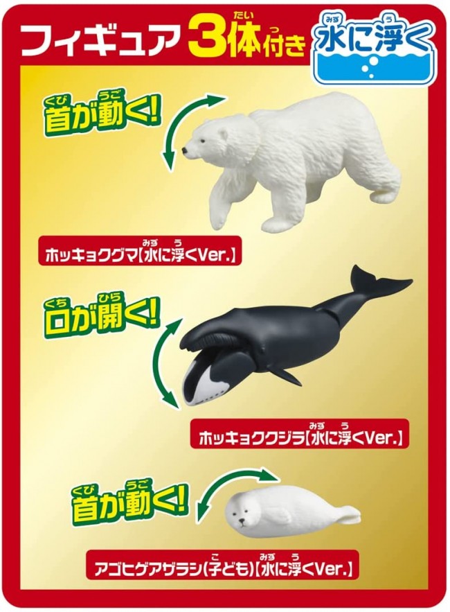 Open the picture book to create a diorama of the Arctic world! All-in-one set with 3 figures and scene parts! It comes with 3 figures and scene parts, so you can play it right away, so it's a perfect item for children who are playing with Ania for the first time. When you finish playing, you can put it in the Ania picture book case and put it away easily. The attached figure is an animal that lives in the Arctic, and you can enjoy pretend play that reproduces the life of the Arctic. The figure is designed to float on water, and comes with three bodies: a polar bear, a bowhead whale, and a bearded seal (children). Scene parts can be freely combined and played. For example, since the two drift ice are designed to float on the water, you can put a bearded seal (child) on it and float it on the water, a bowhead whale breaks the two drift ice and slips through between them, or a polar bear is put on the cave. And so on, it will liven up the pretend play. In addition, you can connect the Ania picture book and go back and forth, and you can play with Tomica. * Sold separately except for the set contents. * Some Tomica models may not play properly. * The picture book case and cave do not float on the water. Please do not bring it into the water. [Set Contents] Ania Picture Book Case (1), Bowhead Whale [Floating on Water Ver.] (1), Bowhead Whale [Floating on Water Ver.] (1), Bearded Seal (Child) [Floating on Water Ver.] (1) ), Cave (1), Float A (table, lid) (1), Float B (table, lid) (1), Scenery sheet (left, middle, right) (3), Seal of seal (1) (c) TOMY
