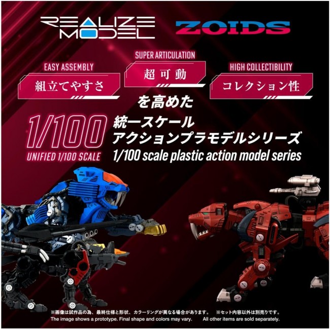 Plastic SF/Anime Character Assembly Kit 1/100 Scale Action Plastic Model Series A 1/100 scale action plastic model series enhanced for “super articulation,” “ease of assembly,” and “collectibility.” By pursuing the user's perspective beyond just part count, size, design, and structure, it embodies every ideal. 1/100 Scale Action Plastic Model. Features a specially designed articulation system allowing full-body movement, enabling various action poses unique to the Tiger-type Zoids, such as sprinting or combat stances. Reproduces the iconic damage scenes from the anime through part segmentation, and includes replacement parts for the front legs. Allows assembly with various weapon parts to recreate the standard unit, or with red armor parts matching the main body color. Includes pilot figures (Raven / Standard Soldier) and an Organoid “Shadow (Wing Retracted)” figure. Contents Runners (1 set), Spring Parts (1 set), Instruction Manual (1) (C) TOMY (C)ShoPro