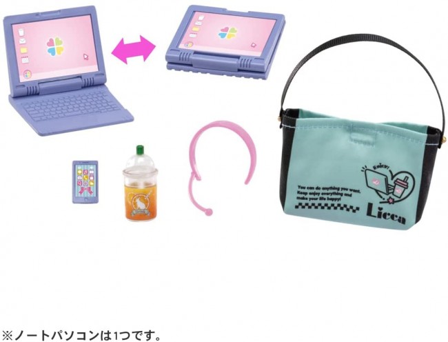 A set of Licca-chan size laptop, smartphone, income microphone, drink cup, and shoulder bag. A laptop can also be a tablet by rotating and closing the monitor. You can store your computer, smartphone, and income microphone in the shoulder bag. [Set contents] Laptop (1), smartphone (1), income microphone (1), drink cup (1), shoulder bag (1) * Dolls are sold separately. (c) TOMY