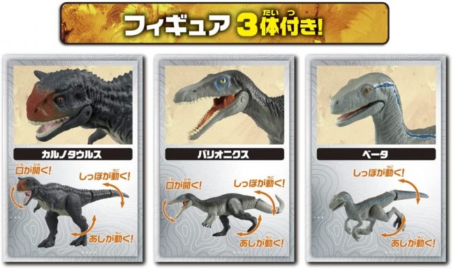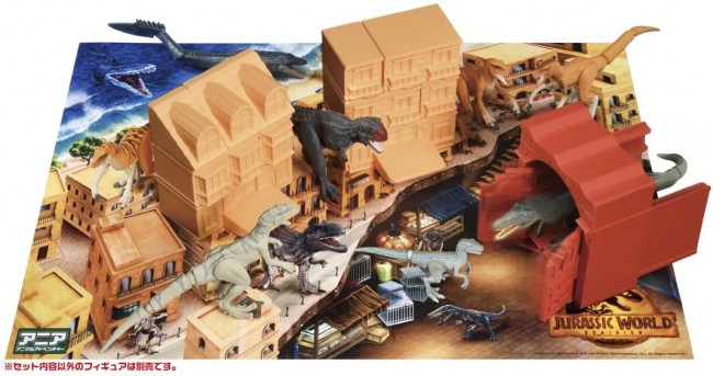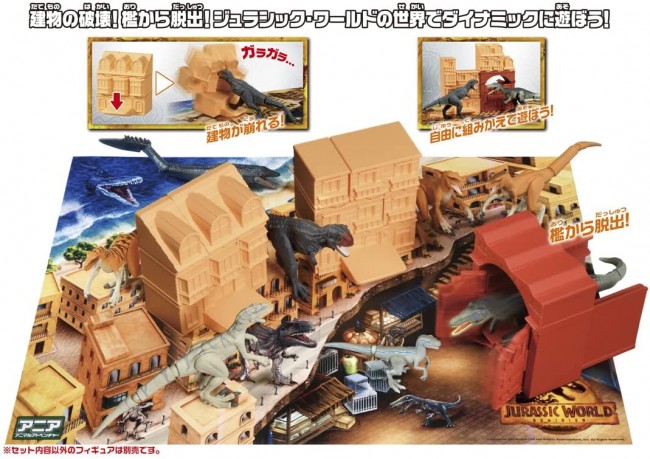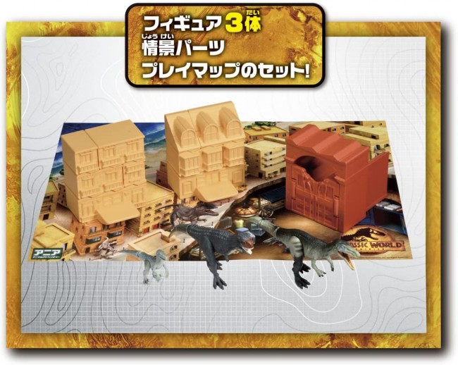 Destroying Buildings! Escape from cages! Play set with map for dynamic play in the world of "Jurassic World"! The dinosaurs can enjoy playing on a play map that recreates scenes from the movie, with building blocks that collapse when ridden by the dinosaurs and can be freely reassembled, and cage scene parts that open the doors. Three figures are included: Carnotaurus, Baryonyx, and Beta, the dinosaurs that appear in the movie. The map reproduces the Malta scene from the play! Various dinosaurs are depicted. All other items are sold separately. The movement and voice expressions in each description are for illustrative purposes only. Ania" is a series of palm-sized gimmick animal figures that can be moved and played with. The "Ania" series is a series of palm-sized gimmicky animal figures that can be moved around and played with. The set also features movable gimmicks, realistic painting and details, and a palm-sized design that makes it easy to play with. Set includes: Carnotaurus (1), Baryonyx (1), Beta (1), Building Block A (1), Building Block B (1), Cage (1), Map (1) (c) Universal City Studios LLC and Amblin Entertainment, Inc. All Rights Reserved. (c) TOMY