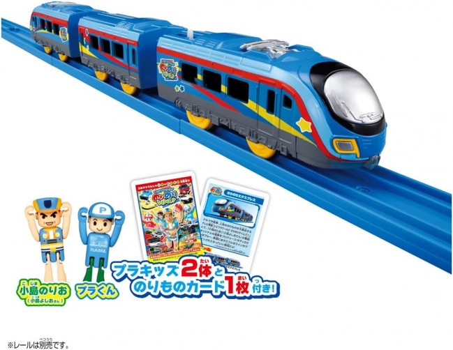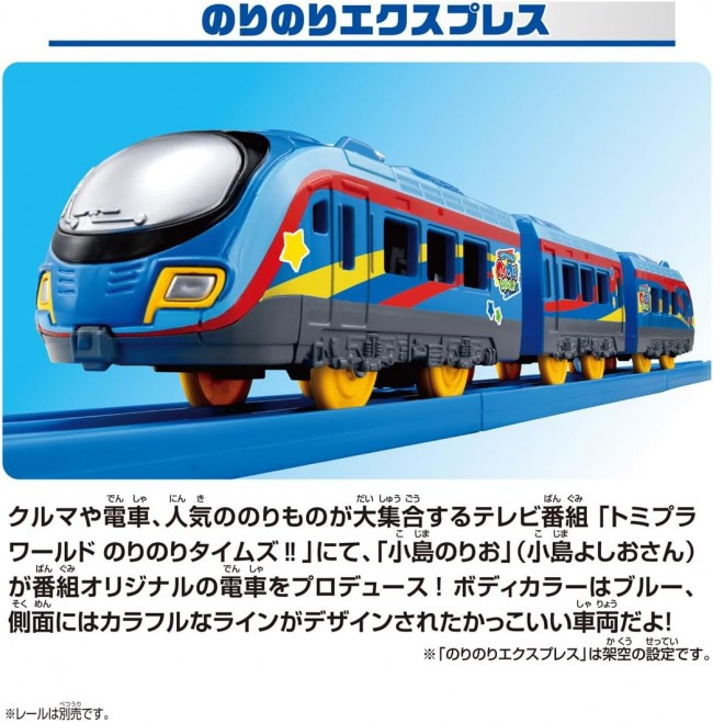 Norio Kojima (Yoshio Kojima) from the show has produced an original train for the program! That special train is now available as a Plarail set! Comes with two figures: Norio Kojima and Plarail-kun! ■Original vehicle featured in “Tomipra World Norinori Times!!” ■Body color is blue, with colorful lines designed on the sides ■Three-car formation, each car can be connected or disconnected ■Electric operation at one speed, can be pushed by hand when the switch is off ■Includes a vehicle card ※Rails are not included. Package size (mm): 410×70×40
