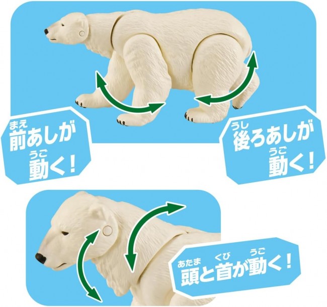 The Polar Bear joins the AL Series. The Polar Bear features movable head, neck, front legs, and rear legs. It can recreate various poses, such as walking on all fours, standing upright on two legs, or swimming in water. It can float in water for play. *Floating behavior may vary depending on posing and environment. Includes two encyclopedia cards (Japanese version, English version). ・ “Ania” is a series of palm-sized, movable animal figures you can play with. ・ It's a product that can be enjoyed as a “3D animal encyclopedia” stimulating children's intellectual curiosity about “learning animal characteristics and types.” ・ Its appeal lies in being “palm-sized,” having “movable distinctive parts,” and featuring “meticulous sculpting.” 【Set Contents】Figure (1), Encyclopedia Card (Japanese Version) (1), Encyclopedia Card (English Version) (1) (C) TOMY