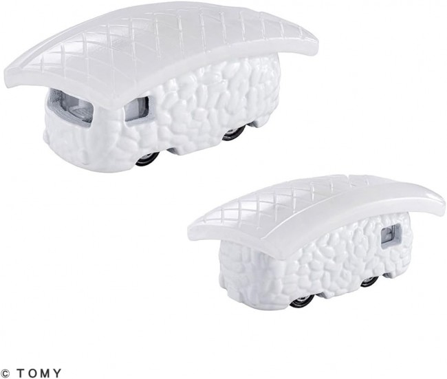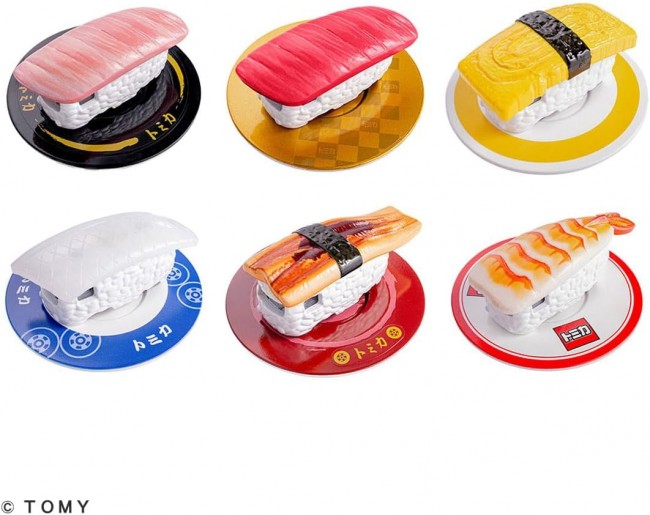 Tomica becomes authentic “sushi”! Introducing the sushi-shaped “Sushi Tomica”. The substantial, weighty rice portion features a car-like driver's seat, front lights, rear lights, and a license plate. The interior is packed with playful details, like rice-shaped seat cushions and a steering wheel hiding a subtle rice grain emblem. Furthermore, the tires are colored a light brown to resemble soy sauce. The toppings include six varieties: fatty tuna, tuna, egg, squid, conger eel, and shrimp. Each comes with a sushi plate featuring a different design! ※1 BOX = 6 pieces You cannot choose the contents. Even when purchasing an assortment box, duplicate items may occur, and you may not receive all varieties. 【Set Contents】 Main Body (6), Plates (6) (C) TOMY