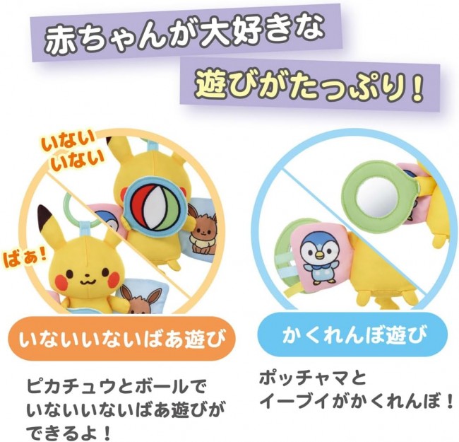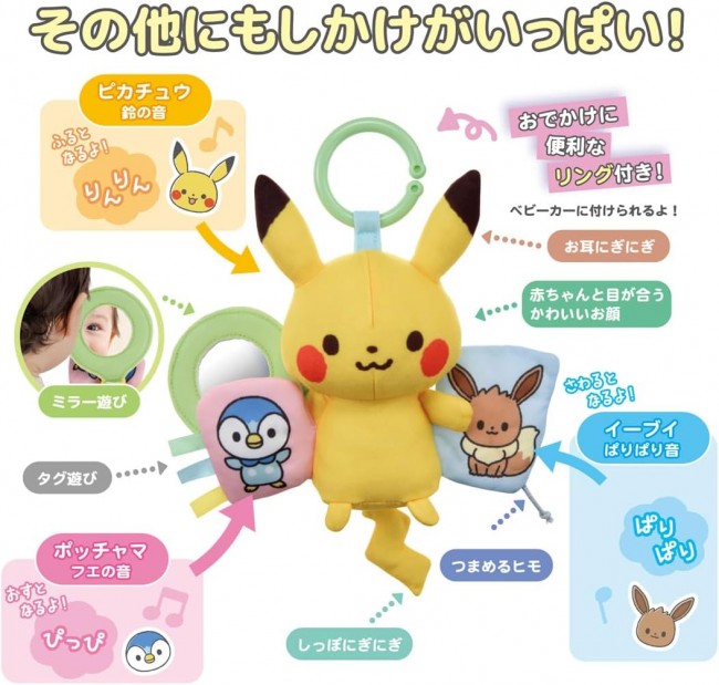 A Pikachu plush toy packed with baby-friendly features. Includes a convenient ring for attaching to strollers. 【Recommended Age】Around 0 months and up?packed with features babies love! ・ Mirror play ・ Various textures (Pikachu, Pochama, Eevee) ・Peek-a-boo play ・Squeeze the tail ・Pull the strings ・Squeeze the ears ・Peek-a-boo play ・Pikachu (bell sound) ・Pochama (whistle sound) ・Eevee (crinkly sound) ・Tag play, etc. 【Set Contents】Ring (1), Main Body (1) (C)Pokemon. (C)Nintendo/Creatures Inc./GAME FREAK inc.