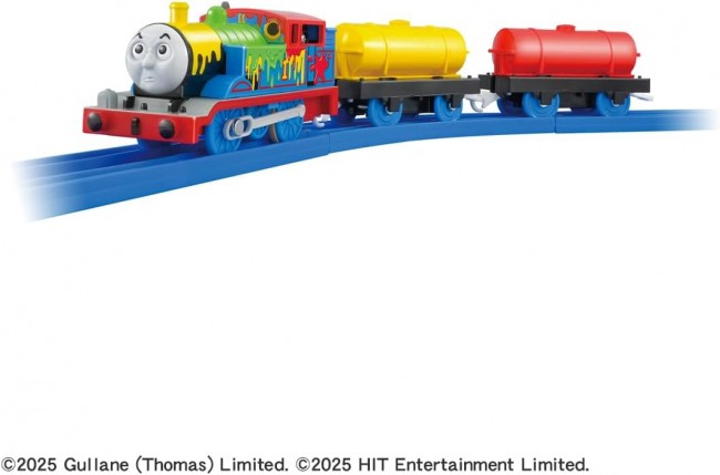 Thomas the Tank Engine's popular character “Thomas” arrives in a 3-car Plarail set! This is Thomas, feeling grumpy after getting covered in paint while delivering it. ■3-car set with each car connectable and detachable ■1-speed with switch OFF for hand-rolling play ※Tracks not included. 【Set Contents】Painted Thomas (Motor Car) (1), Paint Tank Freight Car (2) (C) TOMY (C)2025 Gullane (Thomas) Limited. (C)2025 HIT Entertainment Limited.