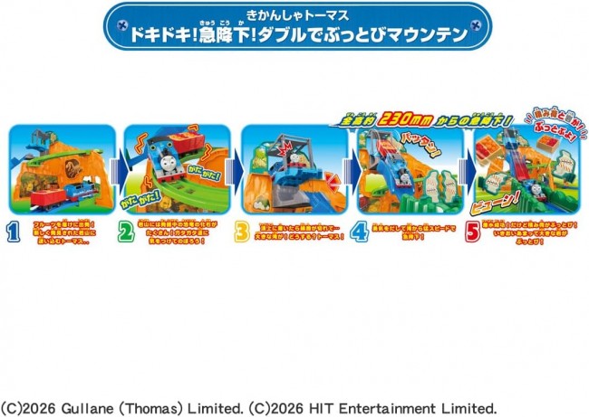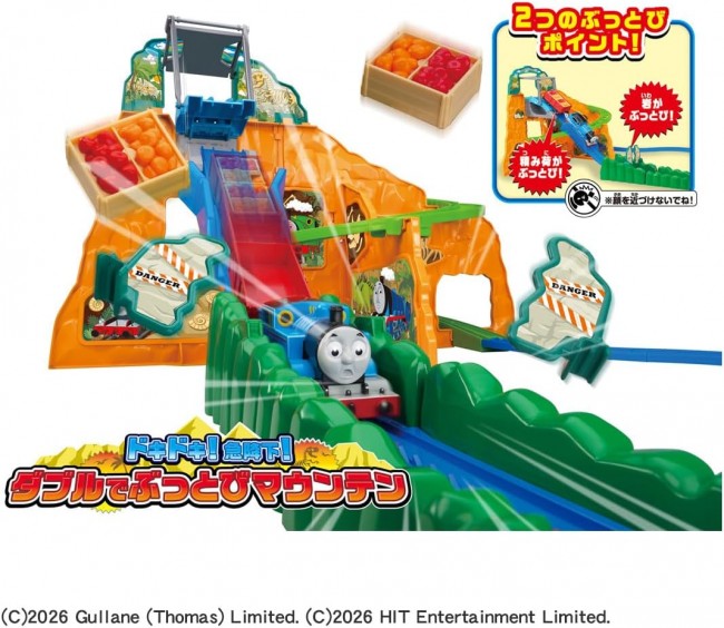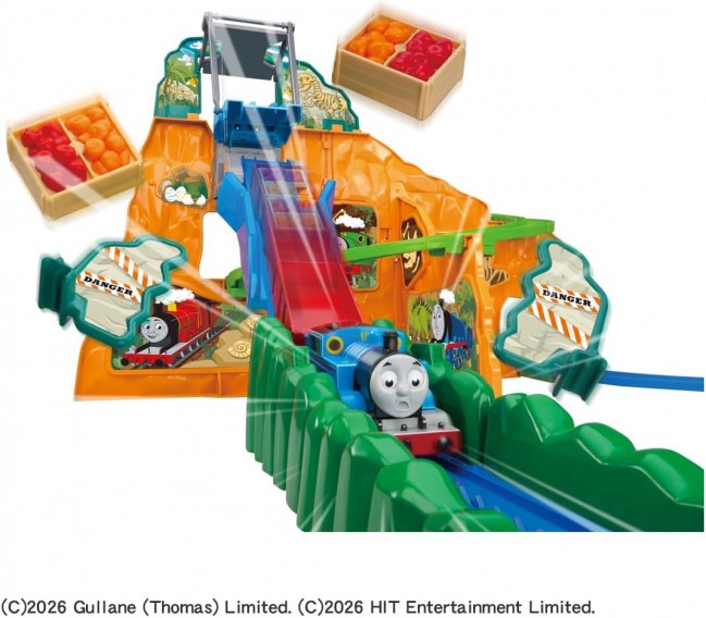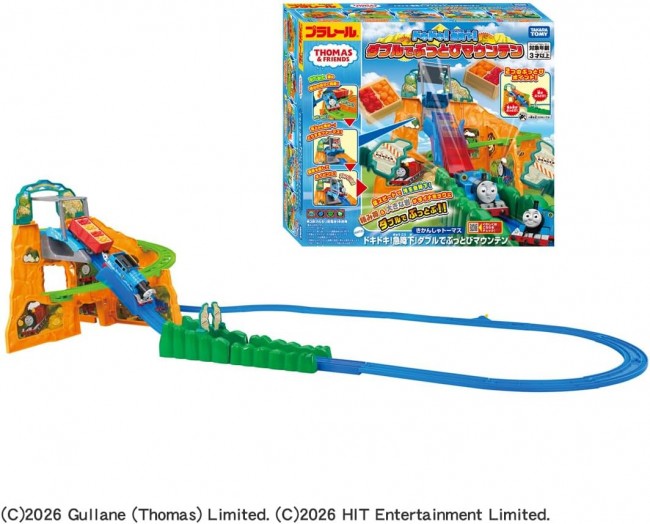 Thomas the Tank Engine hurtles down the waterfall at breakneck speed! The momentum of the steep descent sends both the cargo and a huge boulder flying in a dynamic double blast! Thrill-packed!! Thomas the Tank Engine zooms down from a mountain peak about 230mm tall like a roller coaster!! The cargo flies off due to the momentum! Plus, the big rock blocking the way also gets blown away! 1. Departing to deliver the cargo (fruit)! Thomas gets lost in the rocky mountain... 2. Climbing bumpily around the rocky mountain! 3. Oh no! The tracks end abruptly! 4. Summoning courage, he plunges down the waterfall at breakneck speed! 5. Splashdown success! Amazing, Thomas! 6. But the cargo flew off! 7. The momentum even sent a huge rock flying! This is an all-in-one set containing the Thomas train, Mountain Panel, and all the Mountain Rails. 【Set Contents】Mountain Panels (1-4) (4), Slope Rails (A-F) (6), Slope Rails (Top) (Bottom) (2), Brake Rail (1), Bridge Rail (1), Bridge Gate (1), Bridge Rods (2), Summit Panel (1), Straight Rails (2), 1/2 Straight Rail (1), Curved Rails (6), Stop Rail (1), Thomas the Tank Engine (Motorized) (1), Sticker (1), Parts Order Form (1), Rock Parts (A) (B) (2), Freight Car (1), Fruit (2) (C) TOMY (C)2026 Gullane (Thomas) Limited. (C)2026 HIT Entertainment Limited. Requires one AA alkaline battery (battery not included).