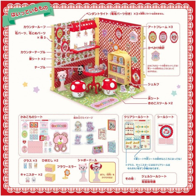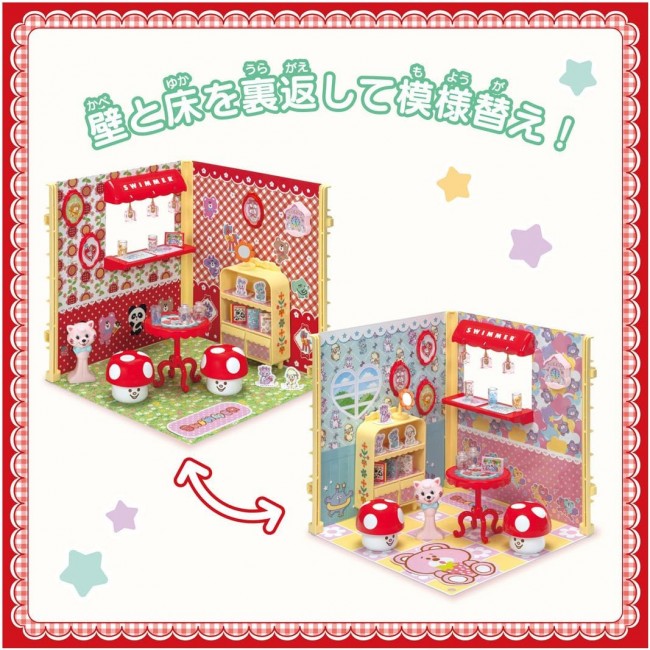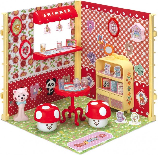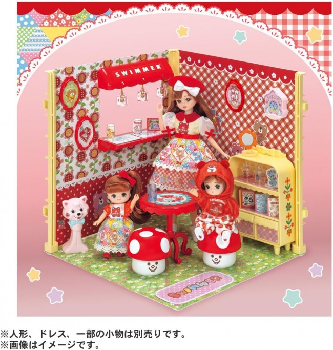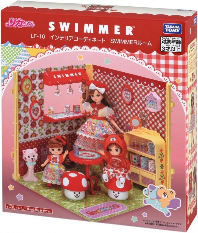 Introducing items that let you enjoy interior coordination in the world of Licca-chan, created in collaboration with the lifestyle brand “SWIMMER”! SWIMMER's adorable goods are faithfully recreated in Ricca-chan size! The collection features SWIMMER's signature cute items like glasses, canisters, flower mirrors, and chapeau dolls. Arrange shelves, tables, and stools against walls filled with SWIMMER characters to create a dream room surrounded by cute SWIMMER items. Ricca-chan's room play becomes even more fun and adorable! 【Set Contents】Floor sheet (1), Wall sheet (2), Pillar parts (3), Pillar fastener parts (3), Shelf (with 2 drawers) (1), Mushroom stool (2), Counter roof (1), Counter table (1), Pendant light (with bulb parts) (3), Wall clock (1), Art Frame (3), Glass (3), Canister (with lid) (2), Flower Mirror (1), Chapeau Doll (1), Paper Craft Sheet (1), Clear Sticker Sheet (1), Sticker Sheet (1), Gel Sticker Sheet (1), Table (1), Instruction Manual (1), *Doll, dresses, and some accessories sold separately. (C) TOMY (C)patty's co., ltd. All rights reserved.