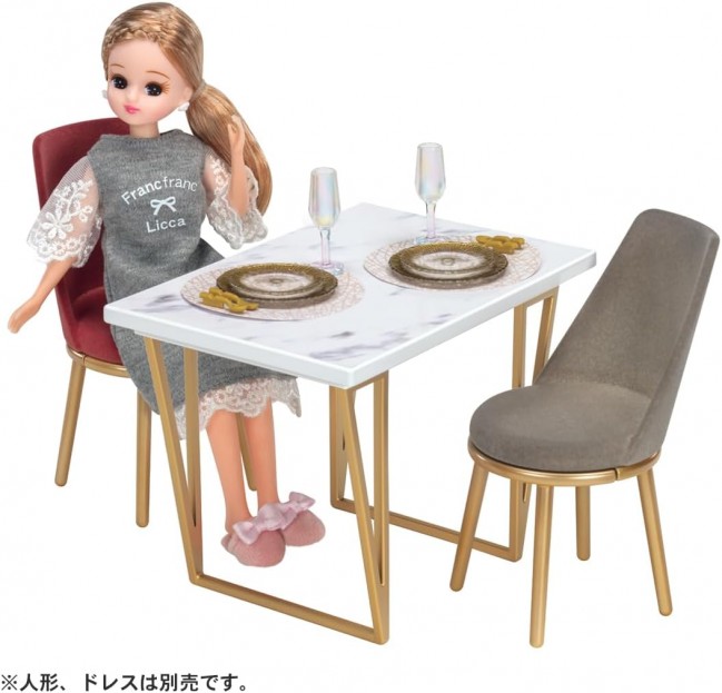 Introducing a stylish dining table set created in collaboration with interior shop “Francfranc”! This table & chair set creates the dining scene you've always dreamed of♪ Includes plates, glasses, spoons, and forks to beautifully enhance your dining experience. Combine it with the separately sold “Dining Room” or “Dressing Room” sets to expand your world even further. 【Set Contents】Table (1), Chairs (Pink, Gray) (2), Plate M (2), Plate L (2), Glass (2), Spoon (2), Fork (2), Paper Accessory Sheet (1), Sticker Sheet (1) (C) TOMY