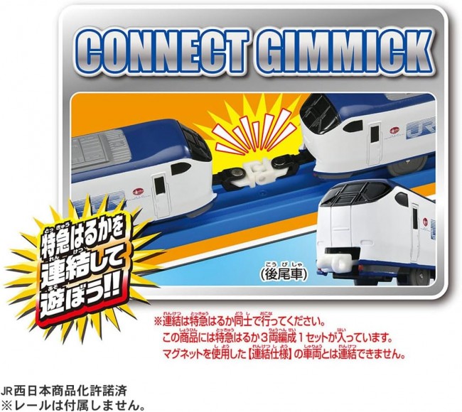 The Kansai Airport Access Limited Express 281 Series “Haruka” is now available in Plarail. This train began commercial service in 1994 and operates between Kansai Airport Station and Kyoto Station/Yasu Station. Its special coupling design allows you to connect multiple Limited Express Haruka trains together for play. ■ Modeled after the “281 Series Limited Express Haruka” ■ Features a dedicated coupling system allowing connection between multiple 281 Series Limited Express Haruka trains for play. ※ Coupling is only possible between 281 Series Limited Express Haruka trains. ※ Cannot be coupled with vehicles featuring the [Coupling Specification] using magnets. ■ Operates with electric power at one speed; can be manually pushed when the switch is OFF. ■ 3-car formation with each car capable of being coupled or uncoupled. ■ Includes plastic train card ※ Tracks are not included. 【Set Contents】 Vehicle body (1), Parts order form (1), Plastic train card (1) (C) TOMY JR West Japan Licensed Product Requires 1 AA battery (battery not included).