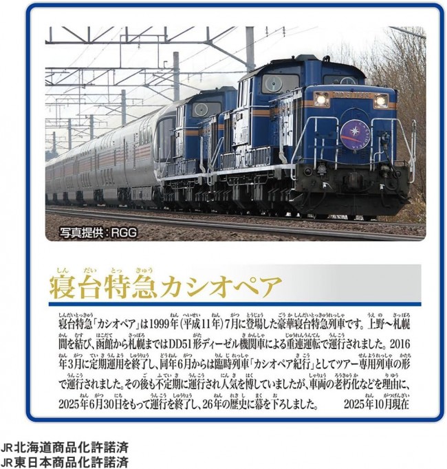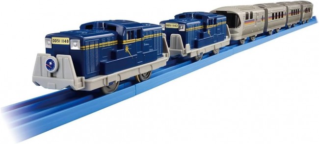 The luxurious sleeper express “Cassiopia,” which debuted in July 1999 and connected Ueno to Sapporo. Until its regular service ended in March 2016, it was pulled by a double-headed DD51 diesel locomotive between Hakodate and Sapporo within Hokkaido. A formation recreating its run across the northern land is now available as a Plarail set. ■Modeled after the Cassiopeia DD51 double-unit configuration ■6-car formation with individually connectable/disconnectable cars ■Electric operation at 1 speed; switch OFF for manual rolling play ■Includes 1 Plarains (Driver) figure ■Second car accommodates Plarains figure for play ※Tracks not included. 【Set Contents】Sleeper Limited Express Cassiopeia DD51 Double-Header Specification × 1 Set (6 Cars) (1), Plar Kids (Driver) (1), Parts Order Form (1) (C) TOMY JR Hokkaido Productization Licensed JR East Japan Productization Licensed Uses 1 AA alkaline battery (battery sold separately).