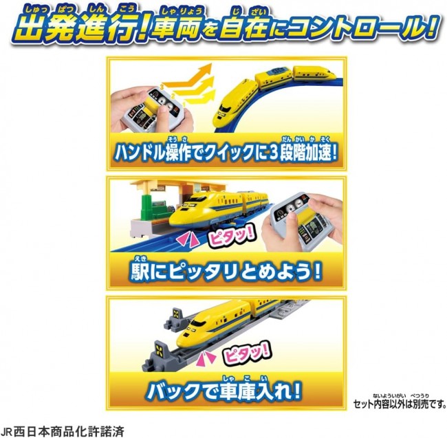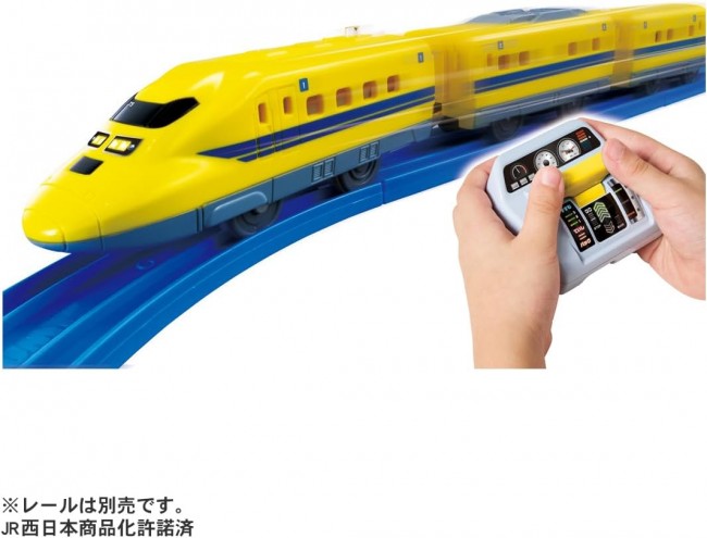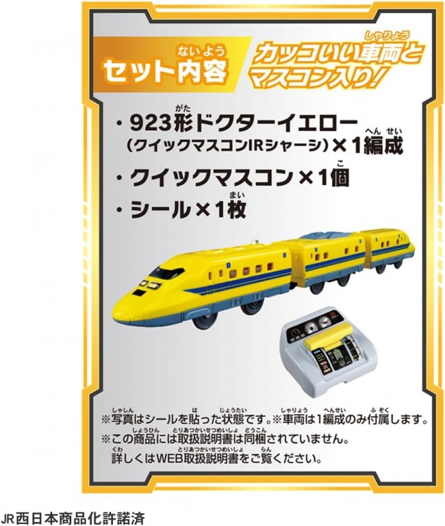 Control the 923 Doctor Yellow with the Quick Mass Con! Quickly operate 3-stage acceleration, stop, and reverse! Easily operate and freely control the 923 Doctor Yellow with the Quick Mass Con! Enjoy realistic running with quick operation of 3-stage acceleration, stop, and reverse!! ■923-type Doctor Yellow vehicle (Quick Mass Con IR Chassis) with T5 formation & light seal included ■Can be swapped onto your favorite Plarail vehicles (sold separately) ※Excluding some vehicles ■With two vehicles from the Quick Mass Con series, you can run them separately by switching between A and B bands ※The set includes only one train formation. ※Rails and scenery other than those included in the set are sold separately. 【Set Contents】923 Series Doctor Yellow (Quick Mass Con IR Chassis) (1), Quick Mass Con (1), Sticker (1) (C) TOMY JR West Japan Licensed Product Vehicle Body: Uses 1 AA Alkaline Battery (Battery sold separately.) Quick Mass Con: Uses 2 AAA Alkaline Batteries (Batteries sold separately.)