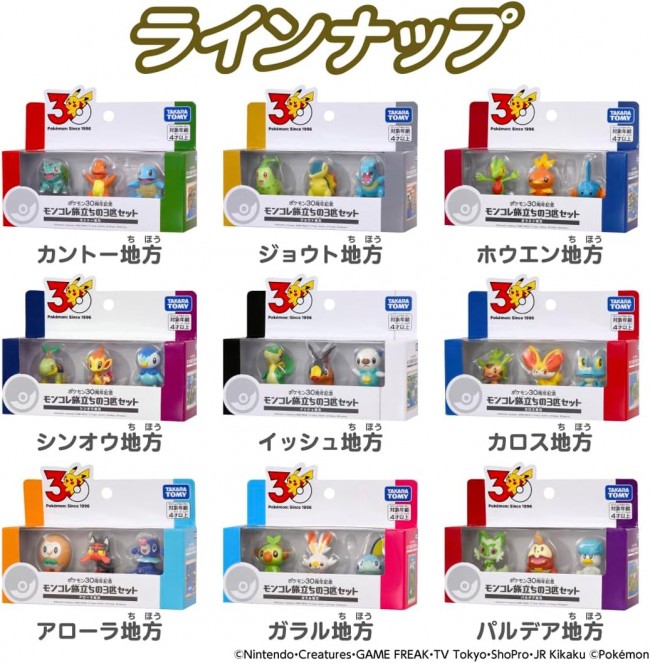 The “Moncolle Departure Trio Set” features three Moncolle figures each of the partner Pokemon you first encounter on your adventures across all nine regions, from Kanto to Paldea. The packaging design reflects each region's unique imagery, making it a special 30th-anniversary edition you can display right out of the box. MonColle is a series of high-quality figures that faithfully recreate Pokemon's appearance. From the top of their heads to their backs, sides, and even the soles of their feet, they're meticulously detailed?pick one up and you might discover a new secret about your Pokemon! Each figure stands approximately 3 to 4 cm tall. (C)Nintendo・Creatures・GAME FREAK・TV Tokyo・ShoPro・JR Kikaku (C)Pokemon