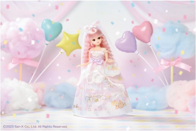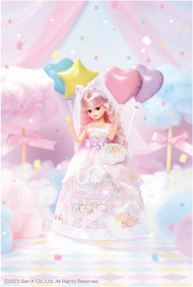 The second collaboration doll between the popular Sumikko Gurashi and Licca-chan! This is Licca-chan in wedding style. Licca-chan is wearing a wedding dress with the popular Sumikkogurashi Yuenchi motif design. Includes headband with veil, shoes, earrings, and bag. [Set contents] Doll (wearing dress, earrings, underwear) (1), shoes (1), bag (1), headband (1) (C) TOMY (C)2023 San-X Co., Ltd. All Rights Reserved.