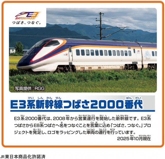 The E3 Series 2000 Subseries began commercial operation in 2008. As its regular service ends, the “Tsubasa, Connecting.” project was launched, embodying the spirit of passing the name ‘Tsubasa’ from the E3 Series Tsubasa to the E8 Series Tsubasa. A Plarail set featuring a vehicle wrapped with the “Tsubasa, Connecting.” logo, which actually ran on the line, is now available. ■ Modeled after the wrapped “E3 Series Shinkansen Tsubasa 2000 Series” train ■ Can be coupled with separately sold compatible vehicles to form longer formations ■ 3-car formation with coupling/uncoupling capability ■ 2-speed electric operation; switch OFF for manual play ■ Includes Plarail Train Card ※ Tracks are not included. 【Set Contents】Vehicle body (1), Sticker (1), Plarail Card (1), Parts Order Form (1) (C) TOMY JR East Japan Licensed Product Uses 1 AA battery (battery sold separately). ※To prevent accidental ingestion, the battery case lid uses a “screw-on” design.