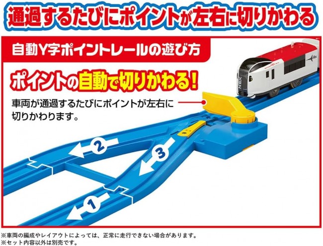 This is a rail that can change from a single track to two tracks. Each time a vehicle passes over it, the point switches, automatically alternating the route left and right. ・This rail changes from a single track to two tracks. Each time a vehicle passes over the point section and pushes the lever, the point automatically switches between left and right. ・The width of the two tracks is the same length as half a straight rail, allowing you to create realistic layouts, such as placing scenery between them. ・The automatic Y-shaped point rail can be placed on top of block piers for play. ・By attaching joint parts to the point section, you can change the direction of the rail's ridges and grooves. ※ Block piers cannot be placed on top of the automatic Y-shaped point rail. ※ Depending on the train formation or layout, normal operation may not be possible. 【Set Contents】Automatic Y-shaped Point Rail (1), Lever (1), Joint Part (1), Y-shaped Point Rail (B) (1) (C) TOMY