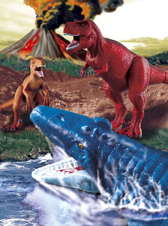 Tyrannosaurus (red color) (1), Velchioraptor (brown color) (1), Mosasaurus (1)