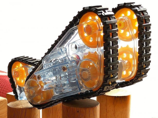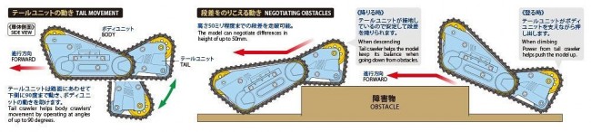 Two triangular crawlers are arranged in parallel, and it consists of a body unit with a gearbox in the center and a tail unit of one triangular crawler that moves up and down like a shippo.