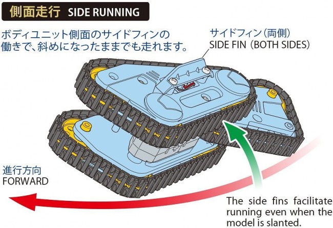 By changing the direction of the side fins attached to the side frame on the side of the body unit, it is possible to run sideways on the wall, or to return to normal running after running sideways.