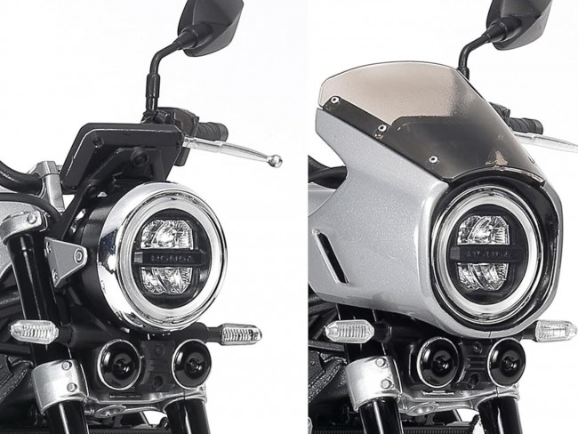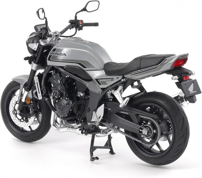Overall length: 178 mm. Photo shows assembled and painted kit. ※Markings: Wolf Silver Metallic (Blue Stripe) ※Choose from 4 specifications using 3 types of markings. ★Modeled after the CB1000F, released last November, part of Honda's long-standing CB series. ★Realistically recreates the integrated form composed of flowing lines. ★The water-cooled inline-four engine is also finished with precision. ★The engine, suspension, and muffler are bolted to the frame. ★The fuel tank and front fender are molded as a single part. Marking: Wolf Silver Metallic (Gray Stripe) The tail lens is molded as a clear red part. The headlight cowl is also molded as a separate part, allowing for optional installation. Radiator grille and center stand included. Tires made of textured synthetic rubber. Marking: Graphite Black Information current as of March 3, 2026. Product name, price, release date, specifications, etc., are subject to change without notice. (From the Tamiya website)
