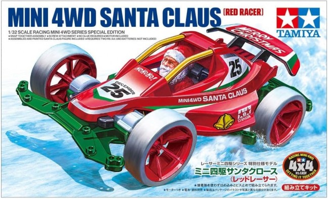Introducing a Mini 4WD featuring Santa Claus with his characteristic cheerful smile. The red body on a green and white chassis evokes the Christmas spirit, and metallic stickers reminiscent of jingle bells add a festive touch. Information is current as of September 17, 2025. Product names, prices, release dates, specifications, etc. are subject to change without notice. (From the Tamiya website)