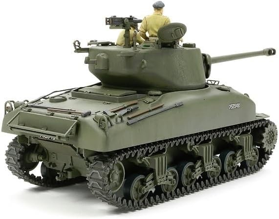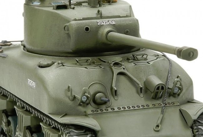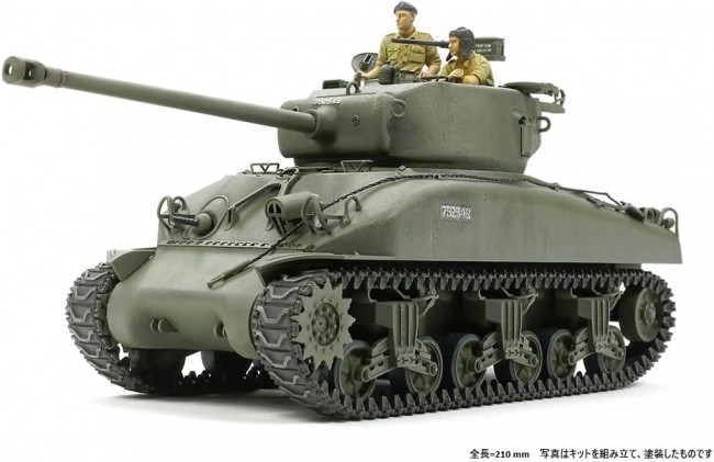 Overall length=210 mm. Photo shows assembled and painted kit. 【 Israel's Savior, the Super Sherman 】 After its founding in 1948, Israel purchased surplus M4 Sherman tanks from Western nations, making them the core of its army. In the 1950s, it introduced the M4A1 Sherman tank equipped with the 76mm M1 gun to counter the Arab side's T-34/85. To distinguish it from the previous 75mm gun variant, it was named the M1 Super Sherman. It featured a rounded cast hull housing a radial air-cooled gasoline engine. Many vehicles were equipped with Vertical Volute Spring Suspension (VVSS) on the running gear. It saw its first combat deployment during the Second Arab-Israeli War, which erupted in October 1956, proving its worth in the desert battles of the Sinai Peninsula. It continued to fight valiantly in subsequent conflicts, with some vehicles remaining in service until the 1970s. 【 Model Specifications 】 A 1/35 scale plastic model assembly kit of the M1 Super Sherman. ● Overall length: 210mm, Overall width: 75mm. Faithfully recreates the imposing presence of the cast hull with its 76mm gun, based on research of actual vehicles in Israel. ● The turret reproduces the late-production type with a main gun featuring a muzzle brake and a one-piece loader's hatch. ● The cast upper hull faithfully models the complex, curved form in full detail. ● The VVSS suspension system is finished with a three-dimensional look. ● The tracks reproduce the metal type known as T54E1. Realistic and easy-to-assemble belt-type tracks. ●Includes two half-body figures (commander and loader) and three types of decals depicting the Second Arab-Israeli War and other conflicts. 【 Initial Release Month 】 July 2011 The marking scheme from the Second Arab-Israeli War era?olive drab monochrome with only the hull number?offers a fresh look. The casting of the upper hull and turret's complex forms, along with the texture of the armor surface, delivers a richly realistic finish. Based on research of the actual vehicle at the Israel Latrun Tank Museum, this model faithfully captures the powerful appearance of the tank equipped with its 76mm gun. Information is current as of September 17, 2025. Product names, prices, release dates, specifications, etc., are subject to change without notice. (From the Tamiya website)