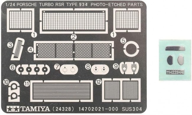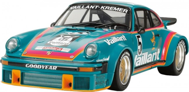 Total length = 179 mm. The photo shows the assembled and painted kit. [The Kremer Team's 934, which won three races in the 1976 DRM] The Porsche Turbo RSR is a production racing car developed for international sports car racing, which began in 1976. Based on the Porsche 930 Turbo, this Group 4 vehicle, also known as the 934 Racing, was produced in a limited run of 31 units. Among them, the machine of the Kremer team, whose main sponsor was the German air conditioning manufacturer “Vaillant,” had a striking finish with orange and pink stripes on a cobalt green base. It was always a top contender, winning the second race of the 1976 DRM (German Sports Car Championship) at Mainz-Finten, the fourth race at Norisring, and the tenth race at Hockenheim. Driver Bob Wolek won the DRM Division 1 class in the annual rankings. [Model Specifications] ● 1/24 scale plastic model assembly kit. ● Length: 179mm, Width: 83mm. ● The model faithfully reproduces the powerful form of the actual car, including the wider overfenders and large rear wing compared to the production model. ● Interior with roll cage, suspension, and underside of chassis feature highly detailed, three-dimensional finishes. ● Main sponsor Viant's air conditioning equipment logo, rabbit mascot, and colorful stripes are provided as slide-applied decals by Caligraph. ● Includes precision-enhancing etched parts and inlet markings. 【 Initial Release Month 】 June 2014 ・The wide flared front and rear fenders and the voluptuous rear view offer plenty to admire. ・An etching part is provided for the mesh air intake openings in the front bumper. ・Etching parts tighten up the detail expression and enhance texture, along with inlet marks for the mirrors. ・The rear section features ample three-dimensionality with separate parts for the six exhaust pipes, turbo unit, rear lower arms, and driveshaft. ・The interior reproduces the roll cage, bucket seats, and ABC (Accelerator, Brake, Clutch) pedals. ・A rear wing distinct from the standard 930 Turbo. The front louvers use resin parts and etching parts. Information is current as of January 28, 2026. Product names, prices, release dates, and specifications are subject to change without notice. (From the Tamiya website)