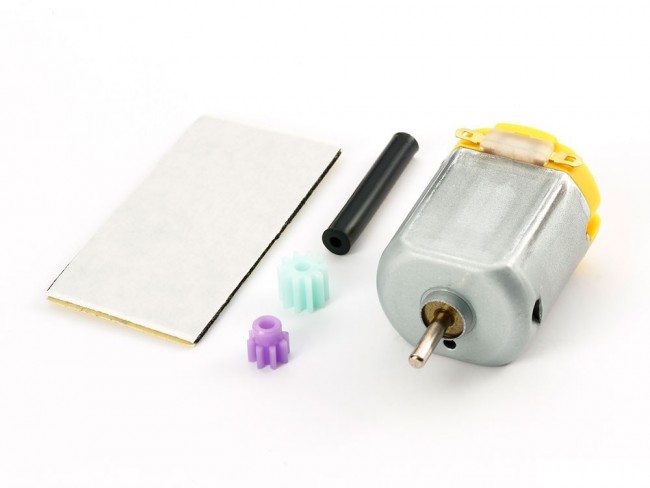 Double-sided tape for motor fixing, two kinds of pinion gears, and rubber pipe for power transmission are also set.