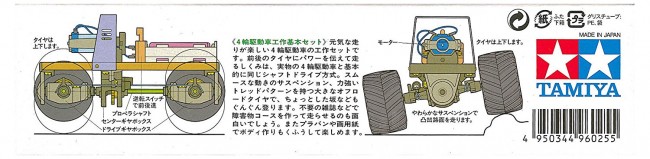 It is an assembly kit for 4 wheel drive car that runs by moving 4 tires with one motor. Adopting a four-wheel drive system of the same shaft drive type as the actual vehicle, which transmits the drive forward and backward from the center gearbox with the motor attached. The center gearbox and the front and rear gearbox are assembled. Both front and rear have a suspension function using stainless steel metal wire and keep the balance of the car body. The tire is a lug pattern type with a diameter of 50 mm and made of resilient hollow rubber. Battery box with reverse rotation switch, back is OK.