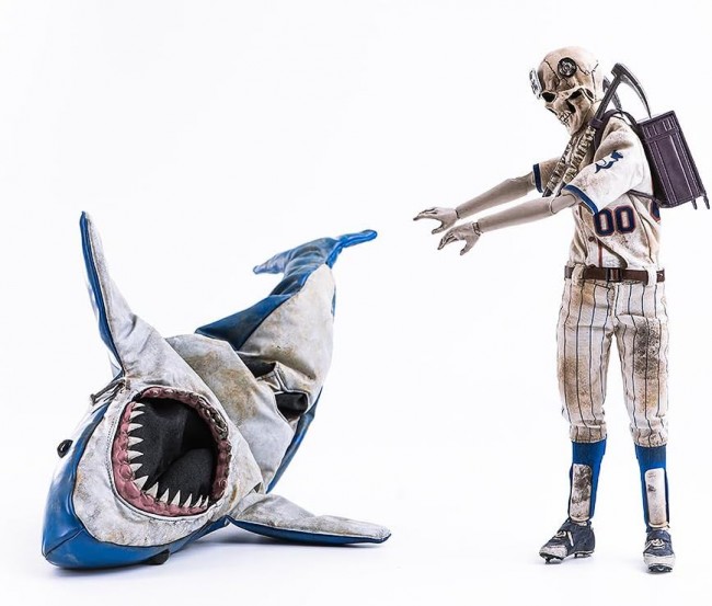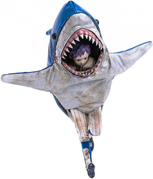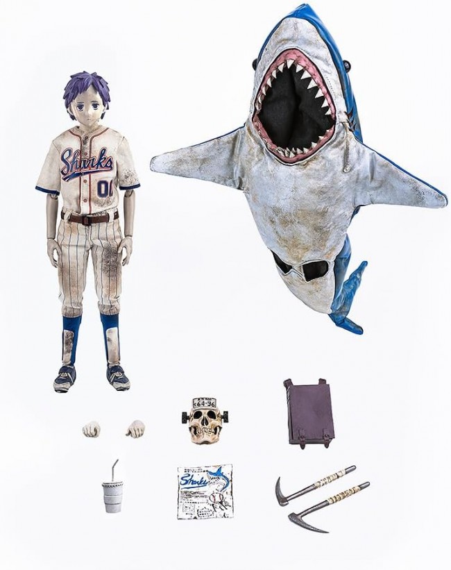Action Figure (Completed/Movable) From the manga “Dorohedoro” comes a 1/6th scale posable figure of Ebisu, the Peace Sharks Mascot version! From the manga “Doro Hedoro” comes a 1/6th scale posable figure of Ebisu, Figuero Ebisu (Heiwa Sharks Mascot version)! She is dressed in the uniform of the “Heiwa Sharks” baseball team, and also comes with a shark mascot costume that the figure can actually wear! Mizugi Gyaru wo Kamikudakku♪ Figuero Ebisu (Peace Sharks Mascot Version) is a fully articulated 1/6th scale figure with approximately 34 points of articulation throughout the body. Ebisu without his costume is approximately 24.5cm tall, and with his costume on he is approximately 28.5cm tall. Two interchangeable heads are included, an early design mask head and a bare face head. The prototype for the bare face head was created by Maki Asai. The main materials used for the figure are PVC, ABS, POM, and cloth. The figure wears a full set of cloth Peace Sharks baseball uniform top and bottom (the cloth costume cannot be removed). The feet are spike shoes. The Peace Sharks shark mascot costume is made of cloth with stuffing to recreate the soft and fluffy texture of the stuffed animal. The shark's teeth are made of plastic. The costume can be easily removed and put on, and a bendable metal wire is built in along the spine from the tip of the nose to the tail, allowing for facial expressions. Also included are two pairs of scythes, a Peace Sharks recruitment leaflet, a square backpack, a drink containing sleeping pills, and two pairs of interchangeable bare hand parts. The left and right hand fins of the costume and the sleeping potion drink each have magnets built in, allowing the drink to be held in the hands while wearing the costume, just like in the movie. Attachment: Heiwa Sharks mascot stuffed cloth mascot (with built-in magnet) × 1, Heiwa Sharks baseball uniform shirt (cloth) × 1, Heiwa Sharks baseball uniform pants (cloth) × 1, belt (synthetic leather) × 1, socks (cloth) × 1 pair, spike shoes (plastic) × 1 pair 2 interchangeable head parts (initial design mask head, bare face head), 1 pair of scythes, 1 Peace Sharks recruiting leaflet (paper), 1 square backpack (plastic), 1 drink with sleeping pills (plastic, built-in magnet), 2 pairs of interchangeable bare hand parts (1 pair of open hands, 1 pair of hands for holding scythes 1 pair) Name of work Dorohedoro Specifications Painted ABS&PVC&POM posable figure (costume made of cloth) - magnet used 1/6 scale Height of the figure itself: approx. 245mm, height of the figure in costume: approx. 285mm Sculptor of bare head parts Maki Asai Sculptor of other parts threezero Manufacturer threezero (C) Q-HAYASHIDA/Shogakukan The photos shown are of a sample product. Some specifications may differ from the actual product. The painting process of the product is done by hand, so there may be slight differences in each product. Please understand this in advance. Due to the nature of the paint, the paint may not be completely dry when the package is opened. If the paint is not dry, place the product in a shady, well-ventilated room for 2~3 days to make sure the painted surface is dry before touching it. If the product is used while it is not dry, it may cause color migration or fingerprint marks. (From Good Smile Company website)