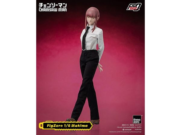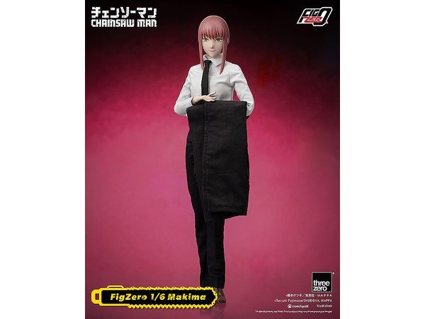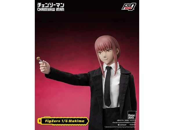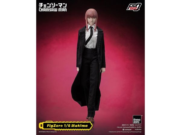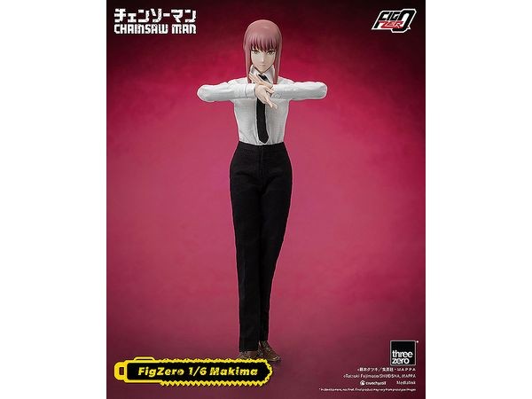 Action Figure (Completed / Movable) From the TV anime "Chainsaw Man" comes a 1/6th scale posable figure of Makima! Makima is the newest addition to the Figuero 1/6th scale movable figure series based on the TV anime "Chainsaw Man"! The figure's head is precisely sculpted and her hand-sewn cloth costume realistically reproduces her appearance in the TV anime. Figuero 1/6 Makima is a fully articulated figure measuring approximately 28 cm in height, with approximately 32 points of articulation throughout the body. The main materials used for the figure are ABS, PVC, POM, and cloth. The braids on the back of her head are made of soft PVC and have wires inside to allow for facial expressions. She comes with two interchangeable facial expressions: a straight face and a smiling face. She also comes with six interchangeable wrist parts for different poses. She also comes with a beer mug, beer parts to put in it, and candy. The costume includes a Y-shirt, tie, pants, and coat made of cloth. The hem of the coat has a wire inside, allowing you to create expressions. 1/6 scale - approximately 280mm in height. ■Accessories: Cloth Y-shirt x1, cloth pants x1, cloth tie x1, 1 cloth coat, 1 pair of shoes, 2 interchangeable facial expressions (straight face and smiling face), 6 interchangeable wrist parts (1 pair of fists, 1 pair of hands posed with palms together, right hand posed pointing, left hand for chin rest, right hand for holding beer mug, right hand for holding candy), beer mug x1, beer parts to put in the beer mug x1, candy x1 Sculptor: threezero (C) Tatsuki Fujimoto / Shueisha, MAPPA