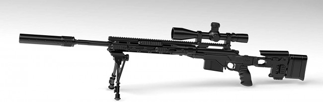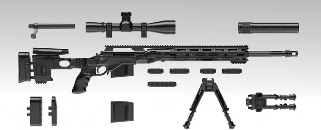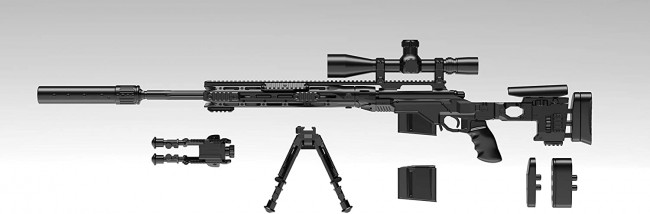 XM2010, a new bolt-action sniper rifle used by the US Army. The ammunition used has been increased from the conventional 7.62mm NATO ammunition to .300 Winchester Magnum ammunition, and the range has been extended to 1200m. Equipped with a box magazine loaded with 5 shots. The metal chassis system allows you to change the position of the stock and attach / detach accessories according to the shooter. In addition, the foldable stock has improved portability, and a detachable suppressor is also standard equipment. This kit also reproduces the characteristics of this gun as much as possible. A removable suppressor, two open / close selectable legs, and a characteristic perforated hand guard have also been reproduced with a slide mold. The folding stock is also movable, and bolt action operation is possible.