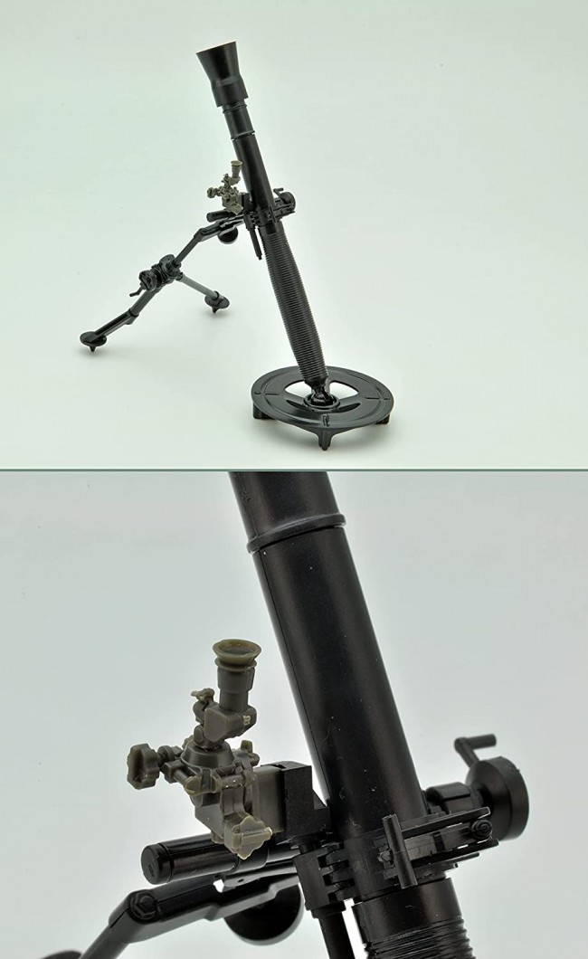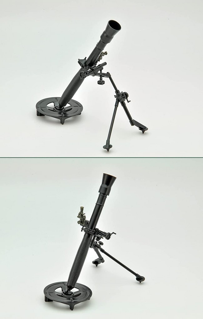 The kit includes a mortar body with two movable legs and a sight, an 81mm shell, and a shell case.