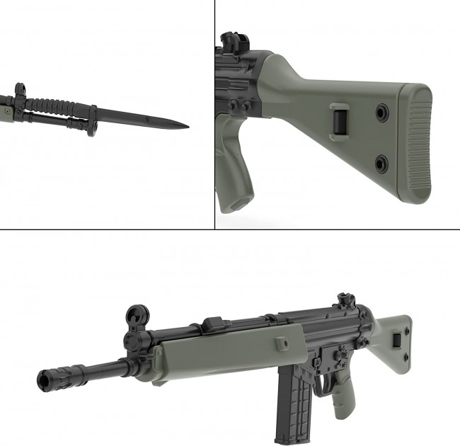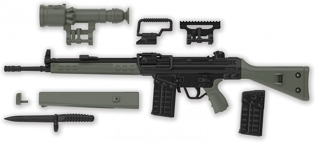 Plastic Model Runner Kit (Colorless) Scale] 1/12 Size] 8.5 cm in length Material] Resin (PS) Other] Molding colors: black and green This 7.62mm caliber German automatic rifle was officially adopted by the former West German Army in 1959. It has an unusual mechanism for an assault rifle that uses the firing recoil to load the next round, and is said to have higher accuracy than standard rifles that use the firing gas to load the next round. This mechanism was also used in the later MP5, a high-precision masterpiece SMG. The G3 was highly acclaimed during the Cold War and was adopted by 48 countries, including NATO members, and was produced under license by 14 countries, becoming so popular that it was called one of the "Four Great Assault Rifles. Various derivative models exist, including the A4 model with a metal telescopic stock and the SG-1 model, which is a sniper rifle with high accuracy. This kit reproduces the "A3" type, a fixed-barrel model of the G3. Selectable carrying handle, bayonet, rail mount and bayonet are provided. A Z51 type night vision scope used by the West German army is also included. Reproduced using two colors of molding. Bayonet mounting selectable. Large hand guard included Fero Z51 night vision Carrying handle can be selected. Rail mount included Reproduction of the partitioning of the parts as much as possible, with an awareness of the composition of the actual gun. Package art by Hankonohito Recommended to use adhesives for plastic models.