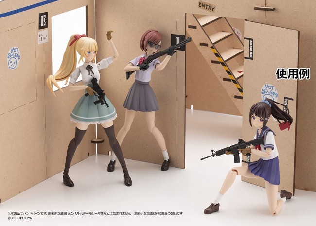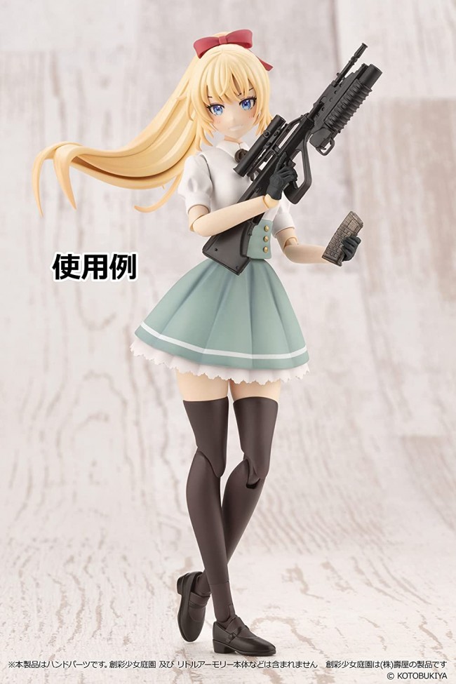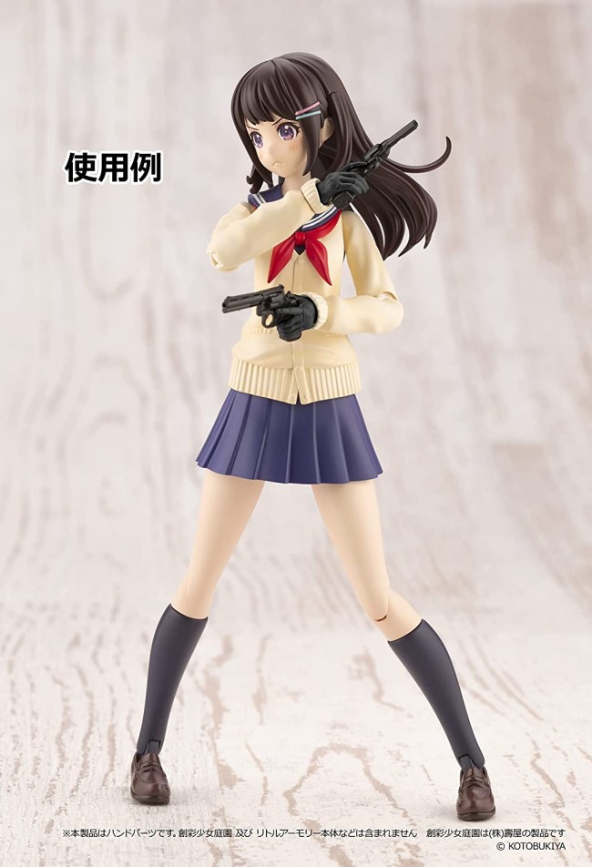 Plastic model / Colorless kit Material] Resin (PVC, PS) Set Contents List Tactical Gloves x 8 (hand to pull the trigger, safety finger, hand to grab and support the handguard, hand to grab the magazine and magwell) Cardigan Sleeve x 6 (0 degrees, 15 degrees, 30 degrees) Angle fixing joint x 10 (0 degrees, 15 degrees, 30 degrees, 45 degrees, 60 degrees) Hand parts to hold Little Armory's firearms for Kotobukiya's plastic model for girls, "Sosai Shoujo Teien" (sold separately). The figure consists of a glove-like soft plastic hand, a joint and a sleeve part for Madoka Yuki [Momozakura High School Winter Uniform] (sold separately). She can be posed in shooting poses, ready positions, mag changes, transitions, and other tactical actions that were difficult to achieve with the existing parts! Cuff parts are included to accommodate Madoka Yuki [Winter Clothes] (sold separately). Joint parts included with Sosai Shoujo Garden can also be used. Due to the variety of shapes and sizes of Little Armory firearms models, some models may not be compatible with this product. Please understand this beforehand. This product is a hand part. The Sosai Shoujo Teien and Little Armory are not included. Sosai Shoujo Teien is a product of Kotobukiya Corporation. (C)KOTOBUKIYA
