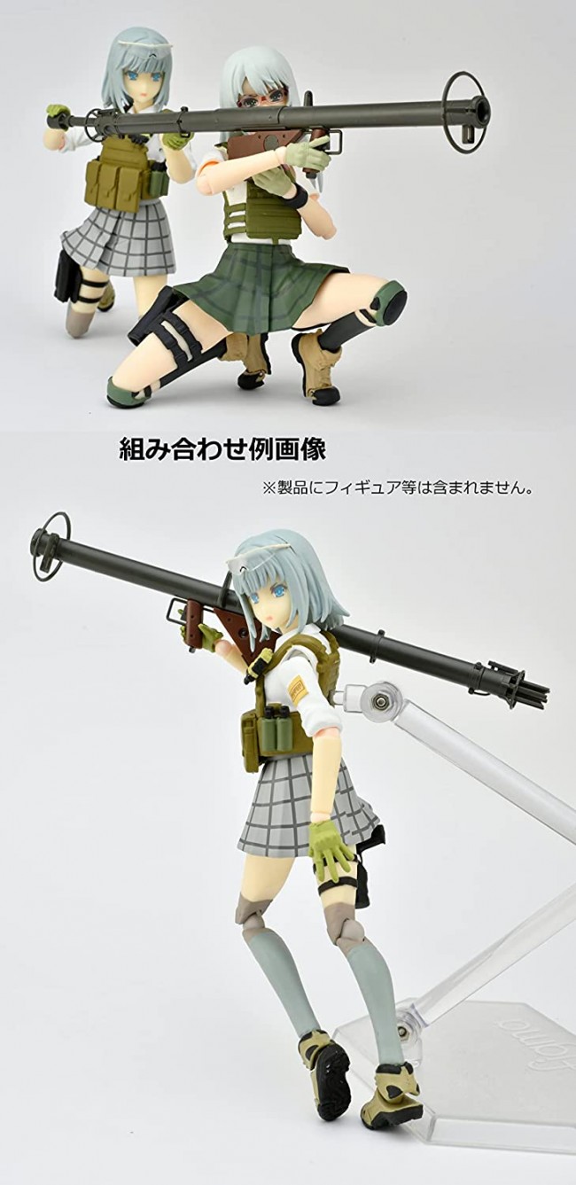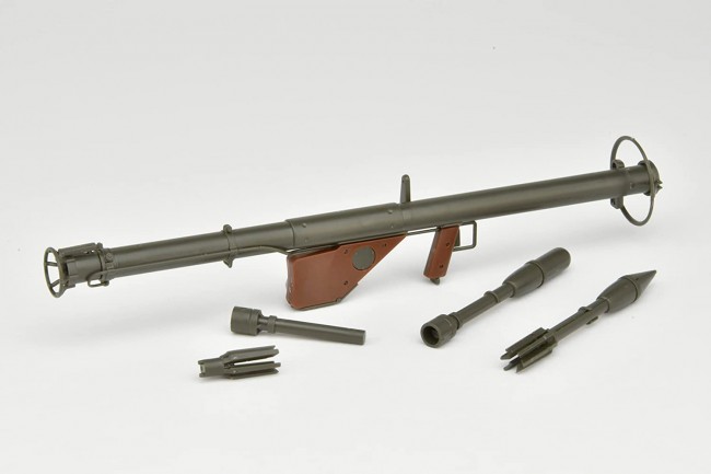 Reproduction of the late model M1A1 bazooka in 1/12 scale. Two types of rockets are included: the lancet-shaped M6A1 and the improved, cylindrical M6A3. Two colors are used for the molding: brown and OD. The stock can be shortened for movable figures. Two types of rocket launchers are included: the lancet-shaped M6A1 and the improved, cylindrical M6A3. The M6A3 can be reproduced loaded or unloaded. Blast guard attached to prevent rockets from blowing back. The mesh surface corresponding to that of the real machine has been omitted for optimum representation in scale modeling terms. The wood and metal parts are molded in different colors to give a realistic appearance even when the model is unassembled. Please enjoy the figure in combination with 1/12th scale movable figures. The box art was newly drawn by Hankonohito! About the M1A1 Bazooka Type: After discovering the strength of "tanks" in WW1-2, each country was looking for various countermeasures. Among them, the "M1 2.36-inch rocket launcher," or "bazooka," was the anti-tank weapon put to practical use by the United States in 1942. This weapon, which had the power to destroy a tank with a single soldier, was so powerful that General Eisenhower, commander of the Allied forces, called it "one of the weapons that led to victory in the war. The name "bazooka" is a nickname given to the weapon because of its resemblance to a prop instrument (bazooka) used by stage performer Bob Burns. LittleArmory M1A1 bazooka type: Specifications 1/12 scale Runner kit (uncolored) Made of resin (PS) Recommended to use adhesives for plastic models Product size: approx. 12 cm in length Figures are not included in the product. All photos are prototypes. They may differ from the product. Product specifications are subject to change without notice. Released/Distributed by TOMYTEC Co. (From the Tomytec website)