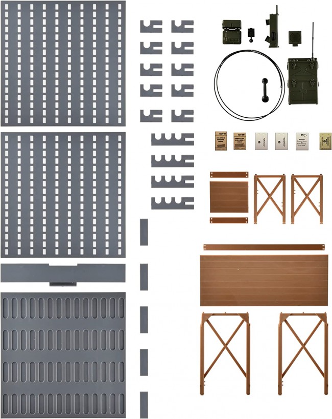 Plastic model/runner kit (Colorless) [Scale] 1/12 [Size] External dimensions: approx. W10 x D10 x H21.5cm [Material] Resin (PS) [Other] Molding colors: gray, brown, black [Set Contents] Floor×1 Wall×2 Hooks x 10 3 hooks x 4 Joint parts x 5 Wall & floor connecting parts×1 Desk×1 Chair×1 Handheld radio SCR-536 x 1 Manpack type radio SCR-300×1 Cryptograph M209 x 1 Morse key x 1 Cable x 1 Cipher table (paper craft) Little Armory", the well-known 1/12 scale plastic model kit of modern firearms with a girl in uniform, has started a new series "STUDY1942" to reproduce various firearms that were developed by the World War II period and became the foundation of modern firearms. This time, the "Command Post" is a scenic item that can be easily matched with the guns in the new series. This is a scene set based on the image of a 1940s U.S. military frontline command post. The set consists of the base floor and walls, a wooden desk and chair made by local craftsmen, and accessories such as a portable radio, cipher machine, and Morse code key from the era. A communication room or an operative's hideout can be created with the model. Classical accessories that match the firearms of the WW2 period. *Figures and guns other than the product are not included. *Recommended to use adhesives for plastic models.
